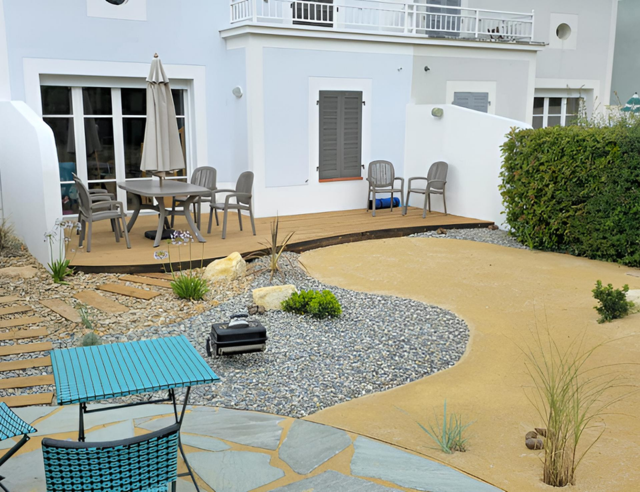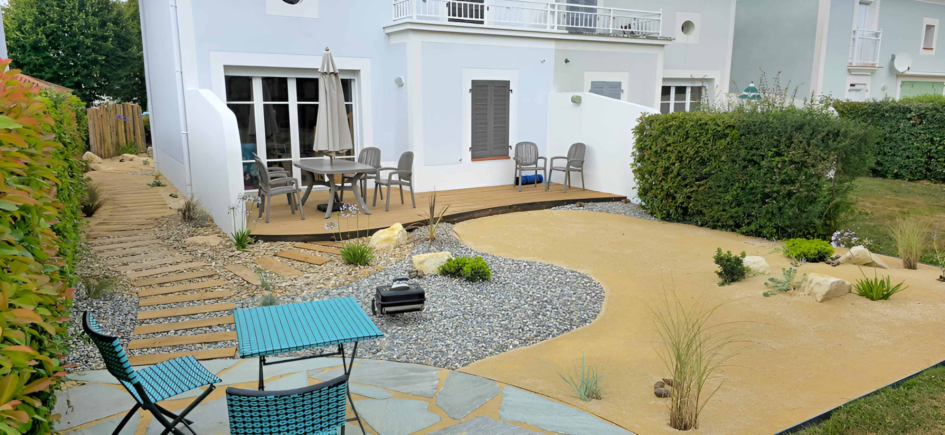 La terrasse bois prolonge naturellement la pièce de vie vers l’extérieur et invite à profiter pleinement des beaux jours. Un cheminement en bois intégré dans le gravier mène vers un espace détente plus intime, créant une circulation naturelle et agréable.