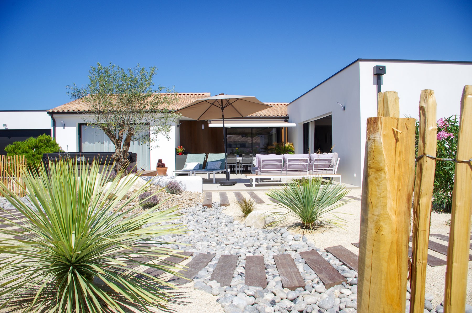 Le challenge Un aménagement complet autour de cette maison juste construite dans une tendance "Oasis intemporelle". Un jardin inspiré du bord de mer, revisité et modernisé, qui invite au voyage. Notre solution Une création paysagère graphique et naturelle qui convient parfaitement aux maisons modernes. L'avantage de ce jardin est qu'il s'adapte très bien au climat...